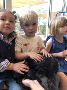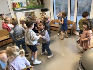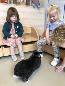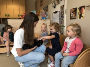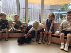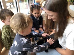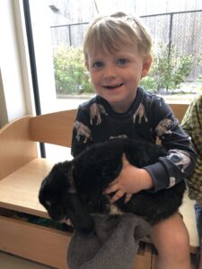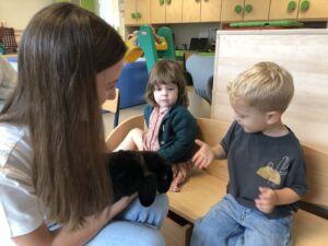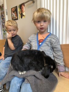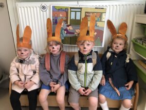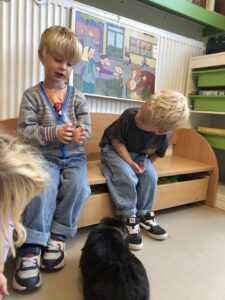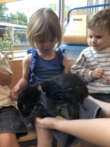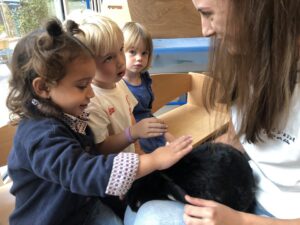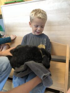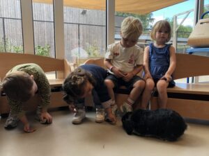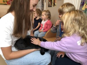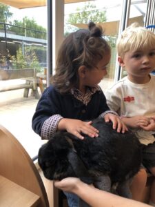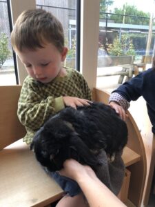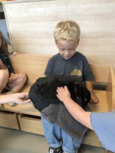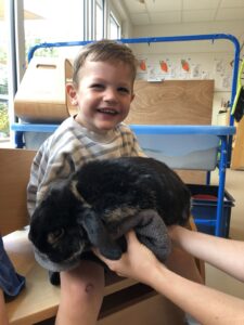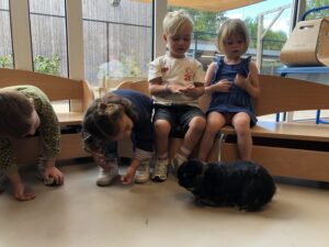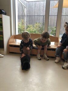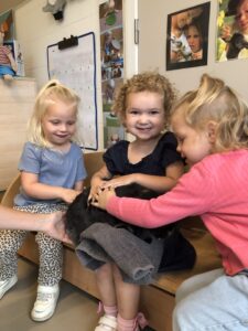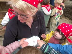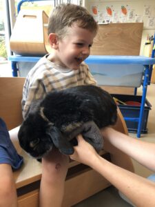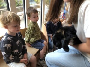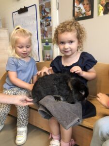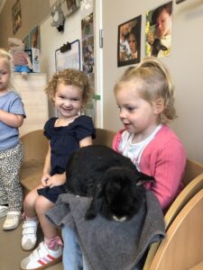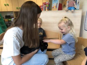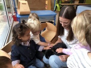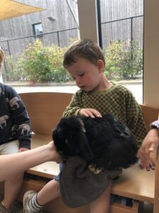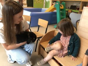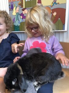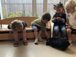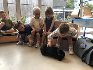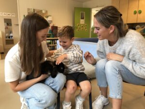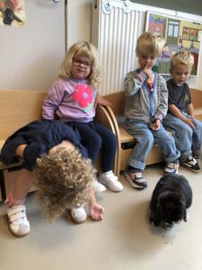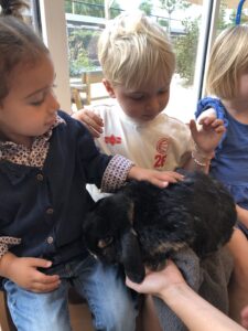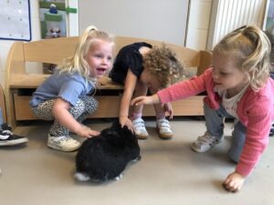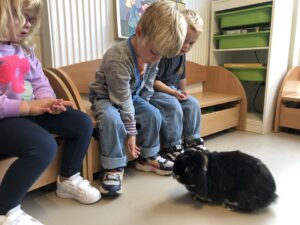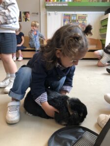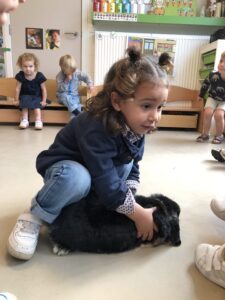 Dinsdagvoormiddag kwam Pauline (familie van César) op bezoek met haar schattig en heel lief konijntje Dustin. Na een beetje wennen aan elkaar waren de kleuters heel enthousiast en huppelde Dustin vrolijk rond in de kring. We konden het konijntje aaien, vasthouden, eten geven, bekijken en vergelijken met andere konijnen, vragen stellen,….. Wat was het een leuke en heel leerrijke ervaring. Hartelijk dank Pauline en mama van César om tijd vrij te maken voor de kleuters van de konijnenklas!