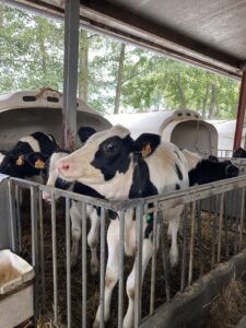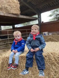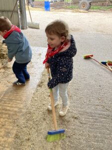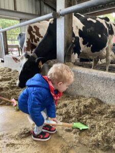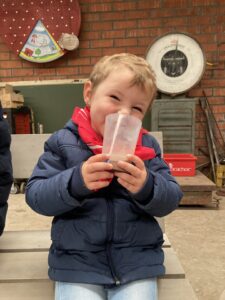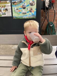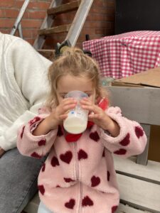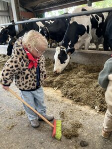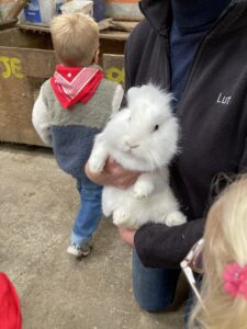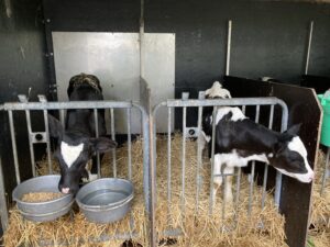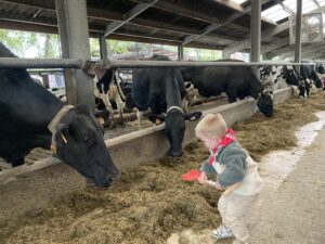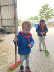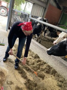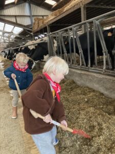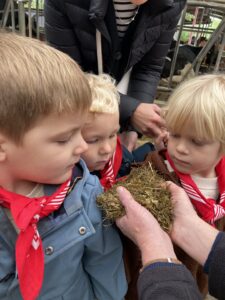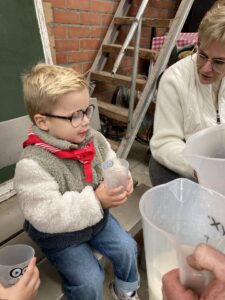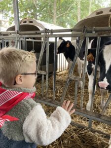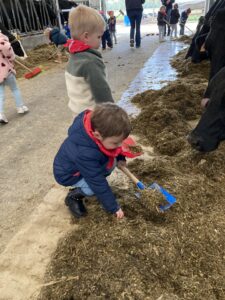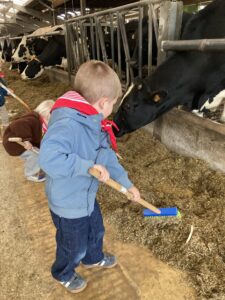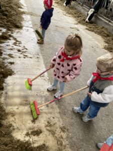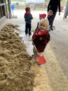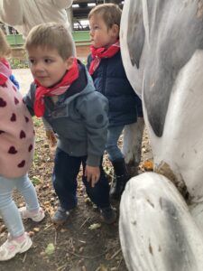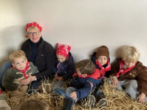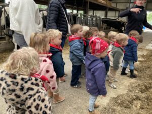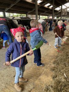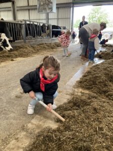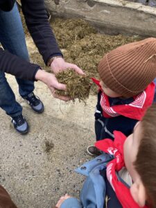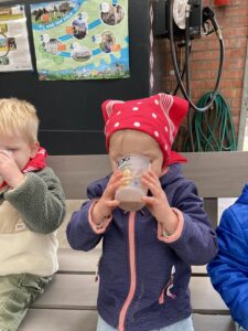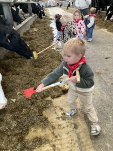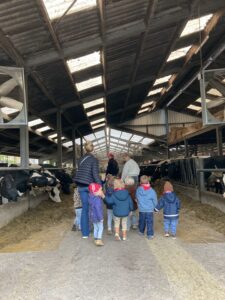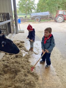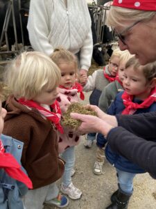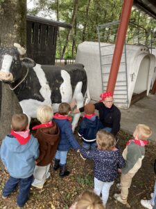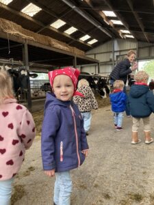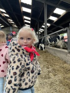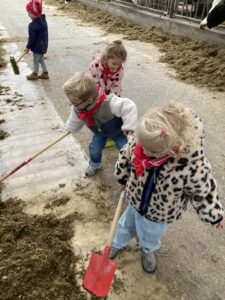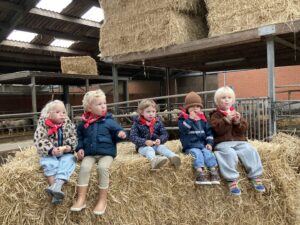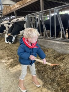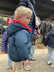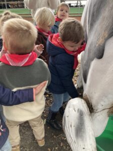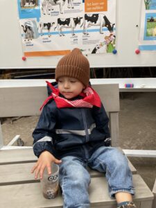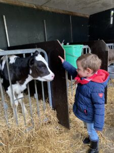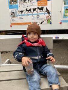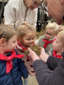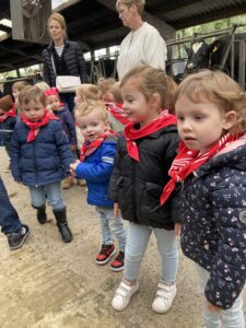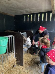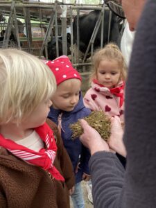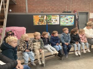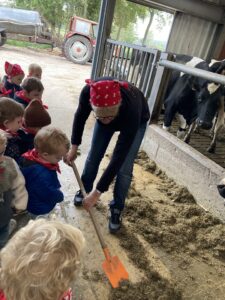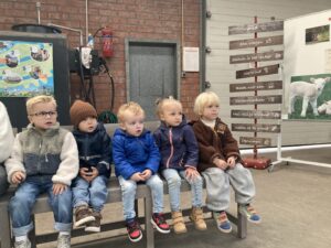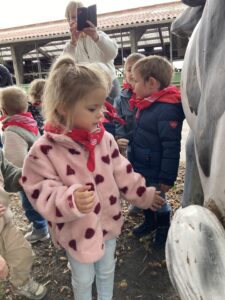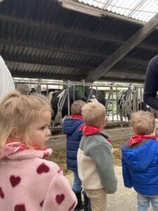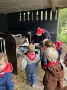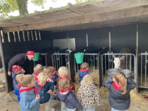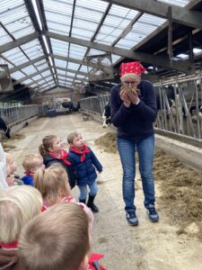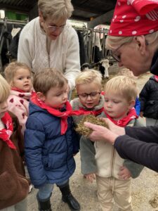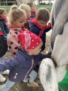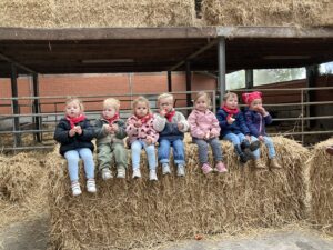 Vandaag gingen we op bezoek bij de boerderij. We zagen de hond, kalfjes, koeien, poesjes, konijnen en schapen. We mochten de kalfjes en konijnen aaien en hielpen de boer en boerin om het eten klaar te leggen voor de koeien. Op het einde kregen we een appeltje en een bekertje verse melk of chocolademelk.