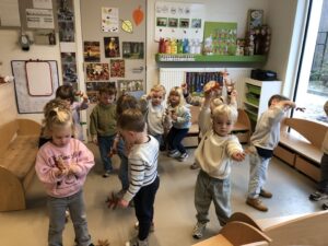 Alle kleuters zagen er enorm naar uit om te gaan sporten in de sporthal Meos. Met sportkledij en tussendoortje vertrokken we enthousiast richting Maldegem met bereidwillige (groot)ouders die voor het vervoer zorgden, waarvoor dank allemaal! Veel uitleg is er niet...