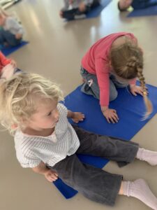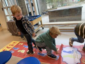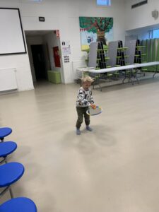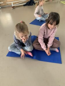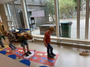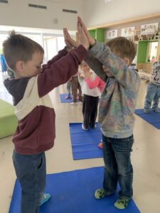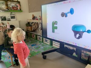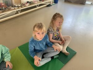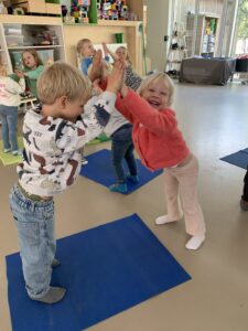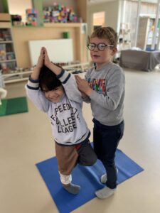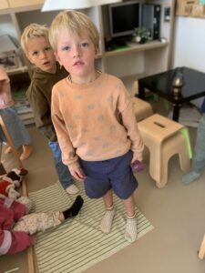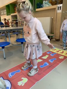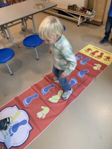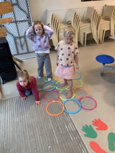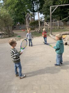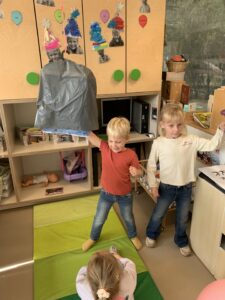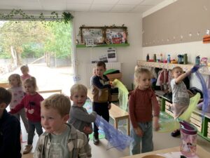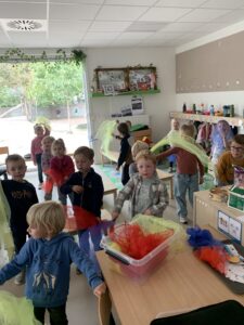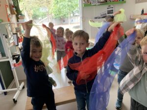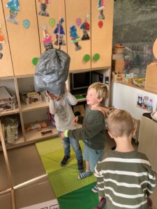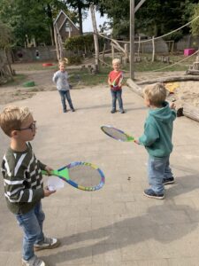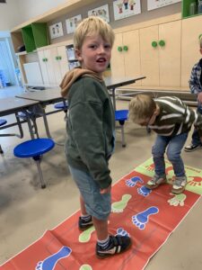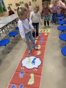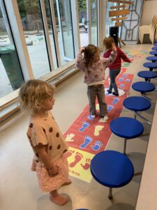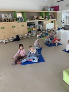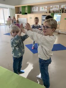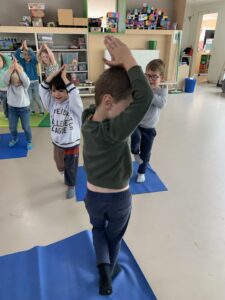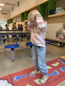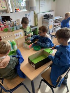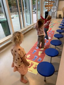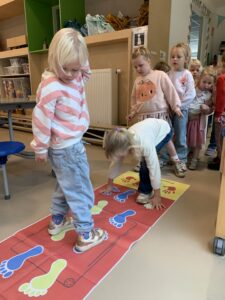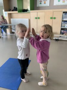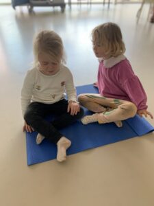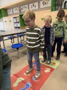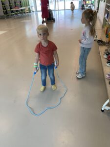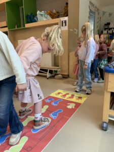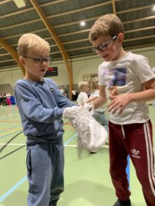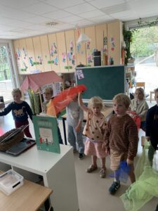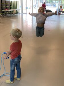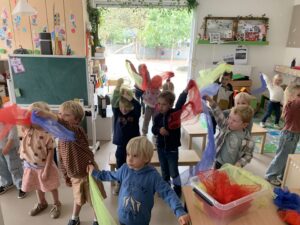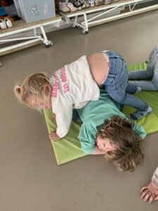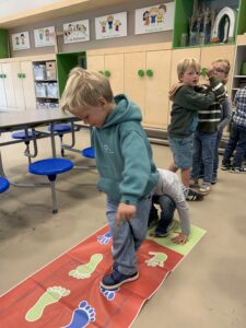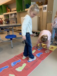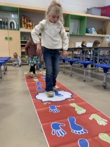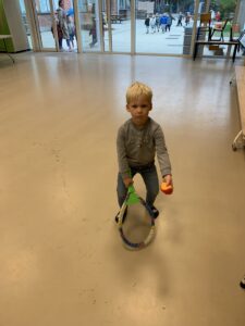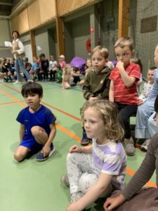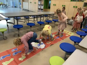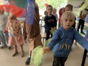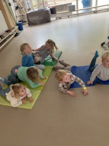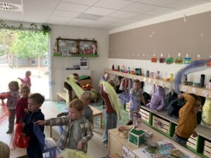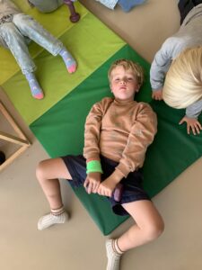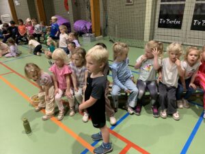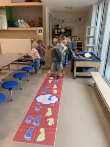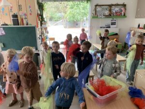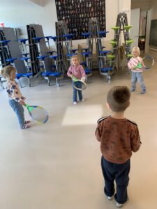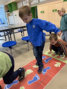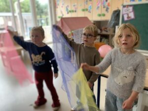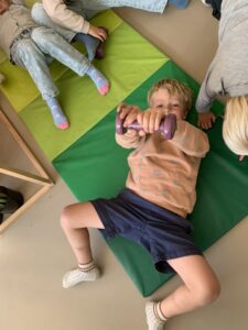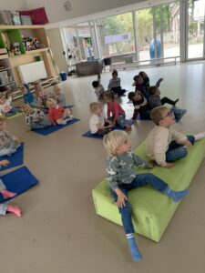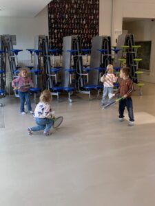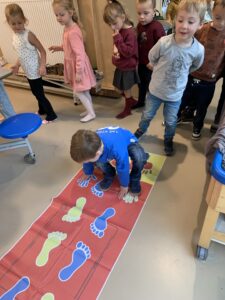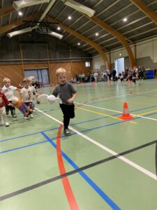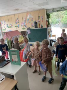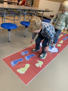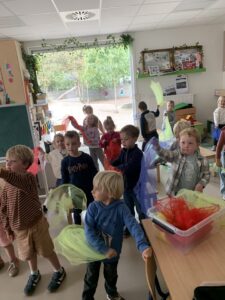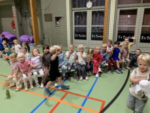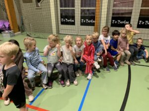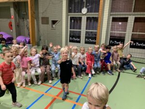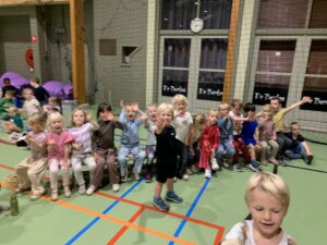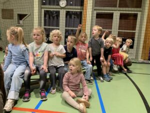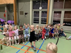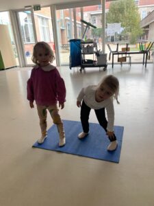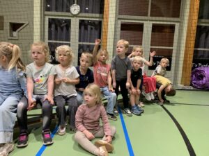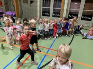 We maakten van de klas een sporthal en leerden verschillende bewegingen, dansjes, liedjes enz. We leerden verschillende sporten kennen en nieuwe begrippen en woordenschat.