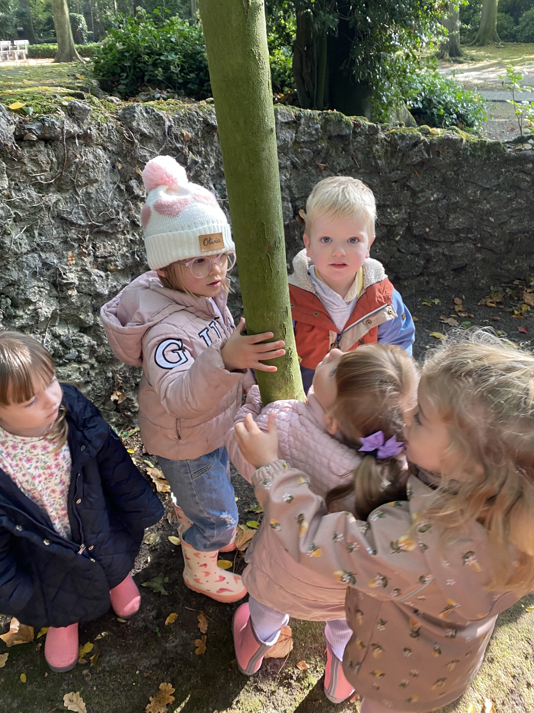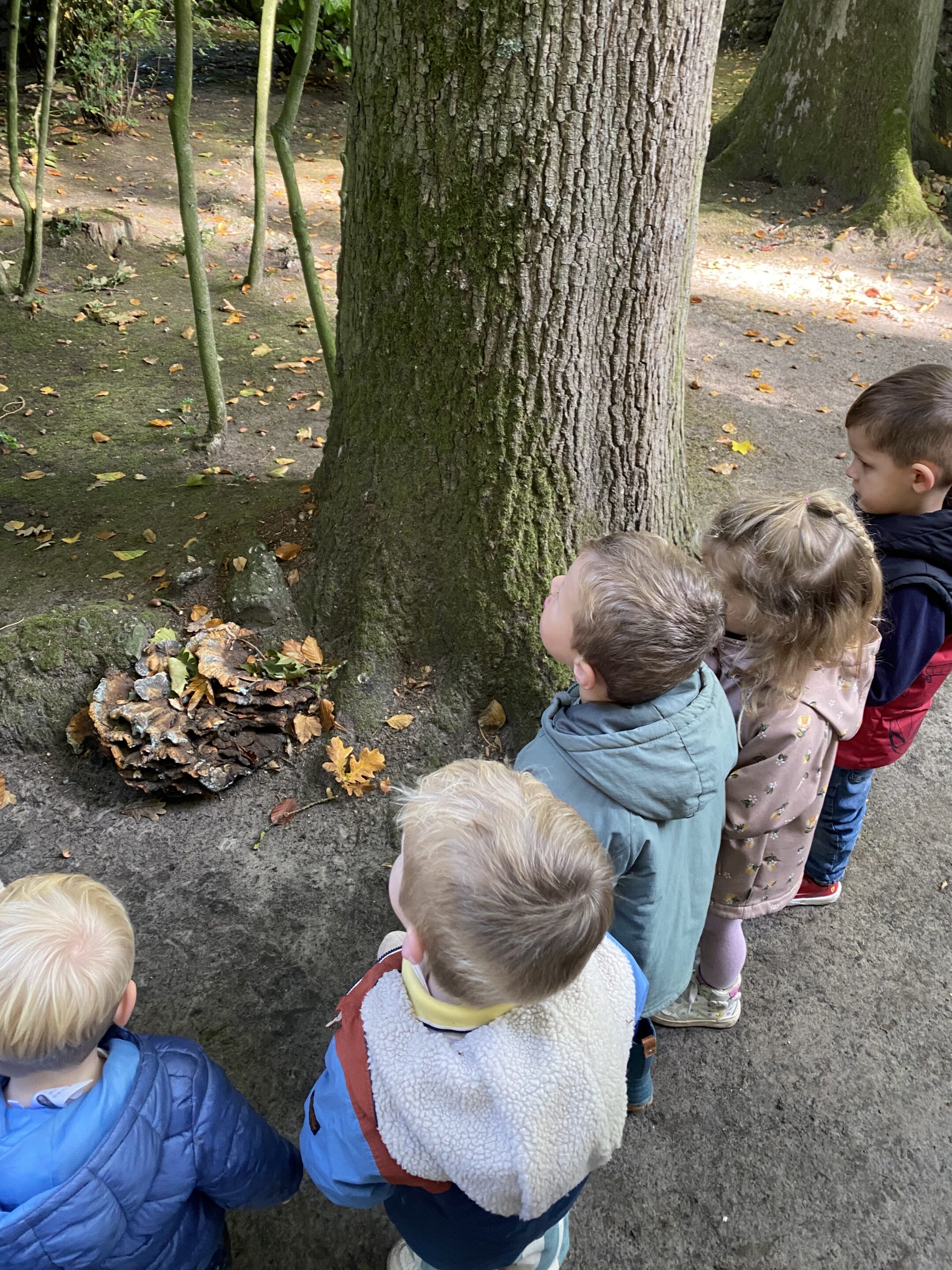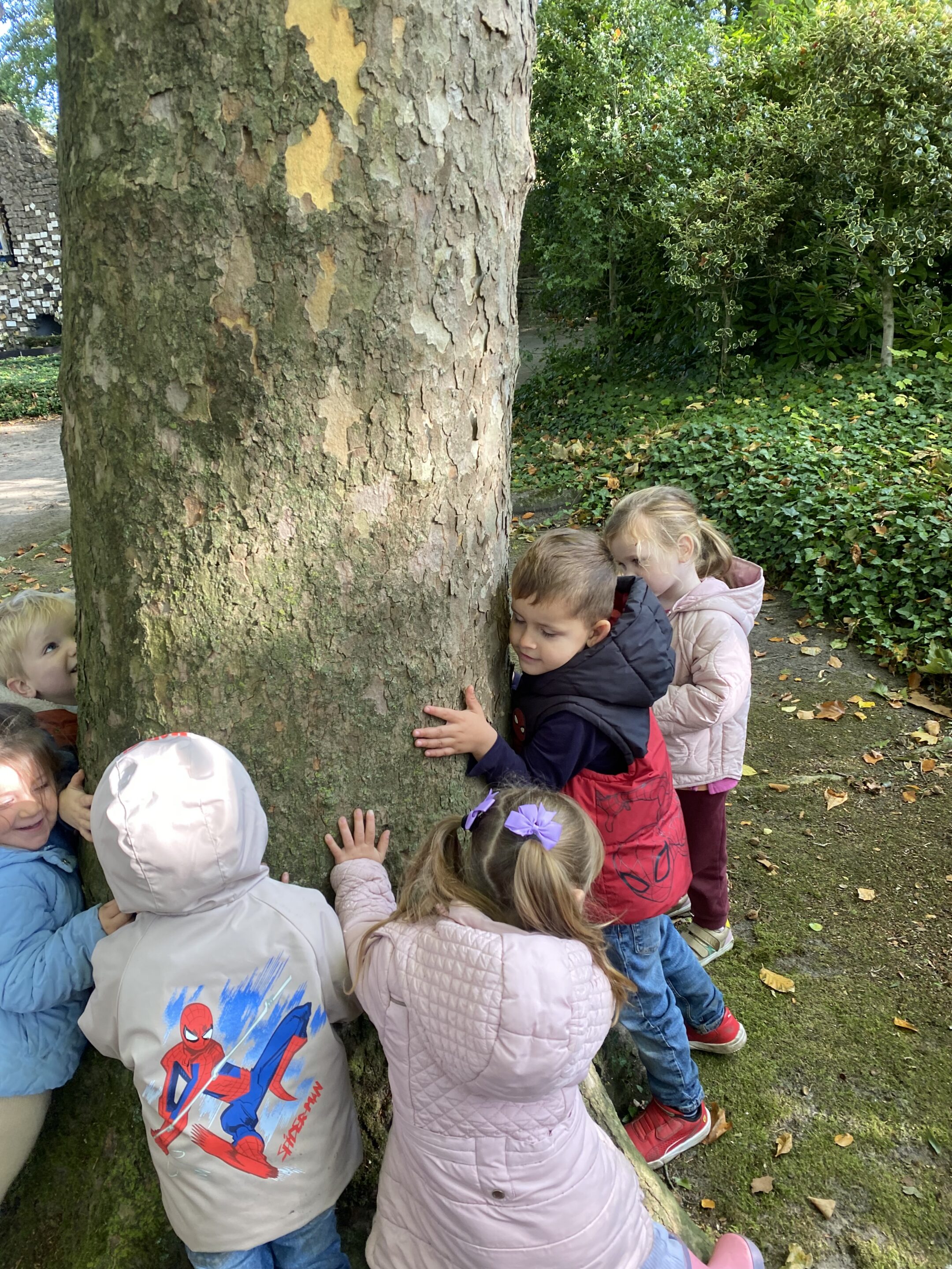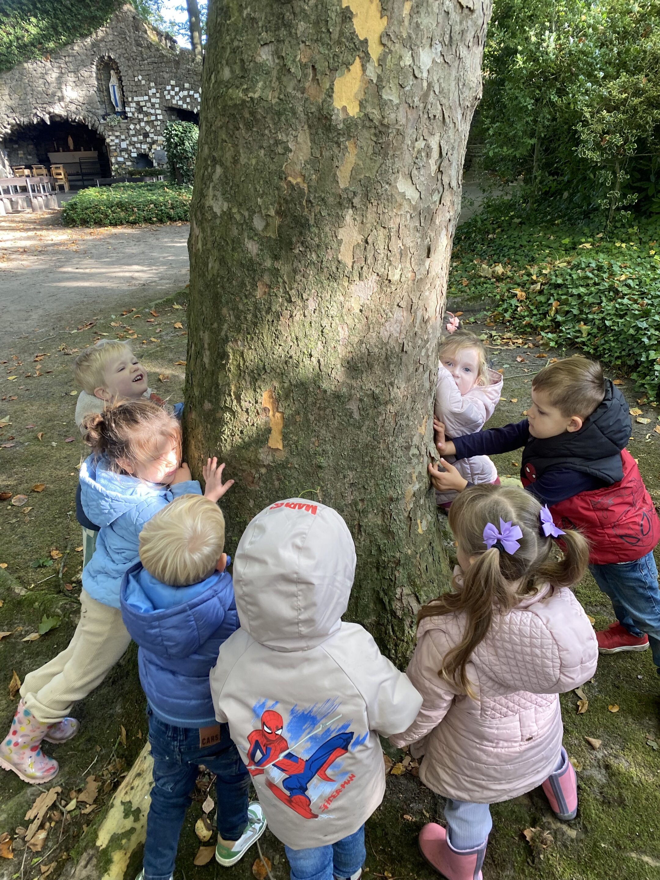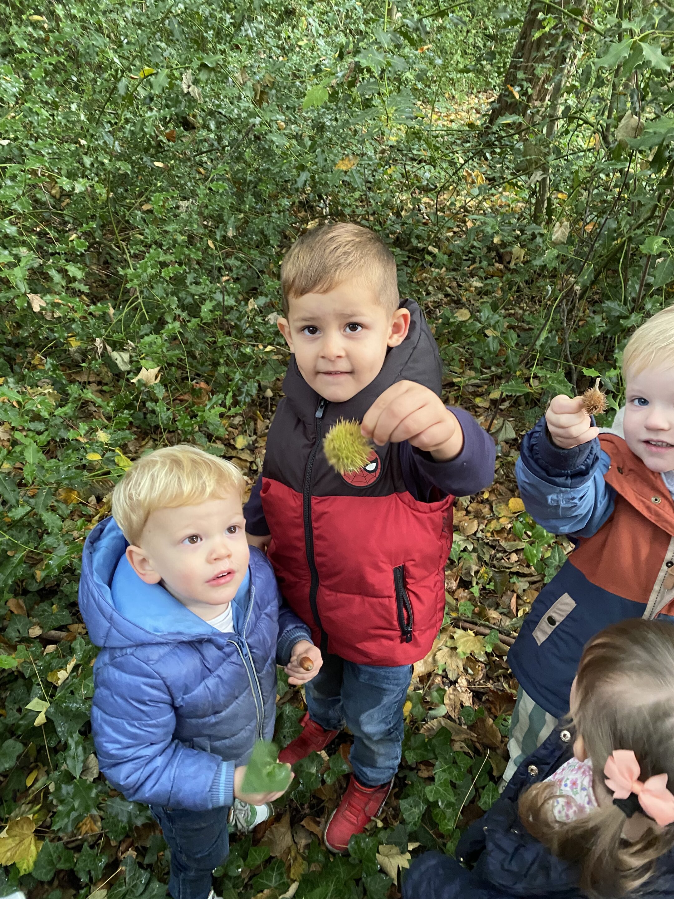 Op donderdagvoormiddag gingen we als start van ons thema: ‘herfstschatten in het bos’ op pad voor een boswandeling. We verzamelden heel wat herfstvruchten zoals kastanjes, eikels, bolsters, beukennapjes, … We sprongen in de blaadjes en gooiden ze in de lucht. We knuffelden de bomen en vergeleken de stammen met elkaar. Wat een mooie voormiddag!