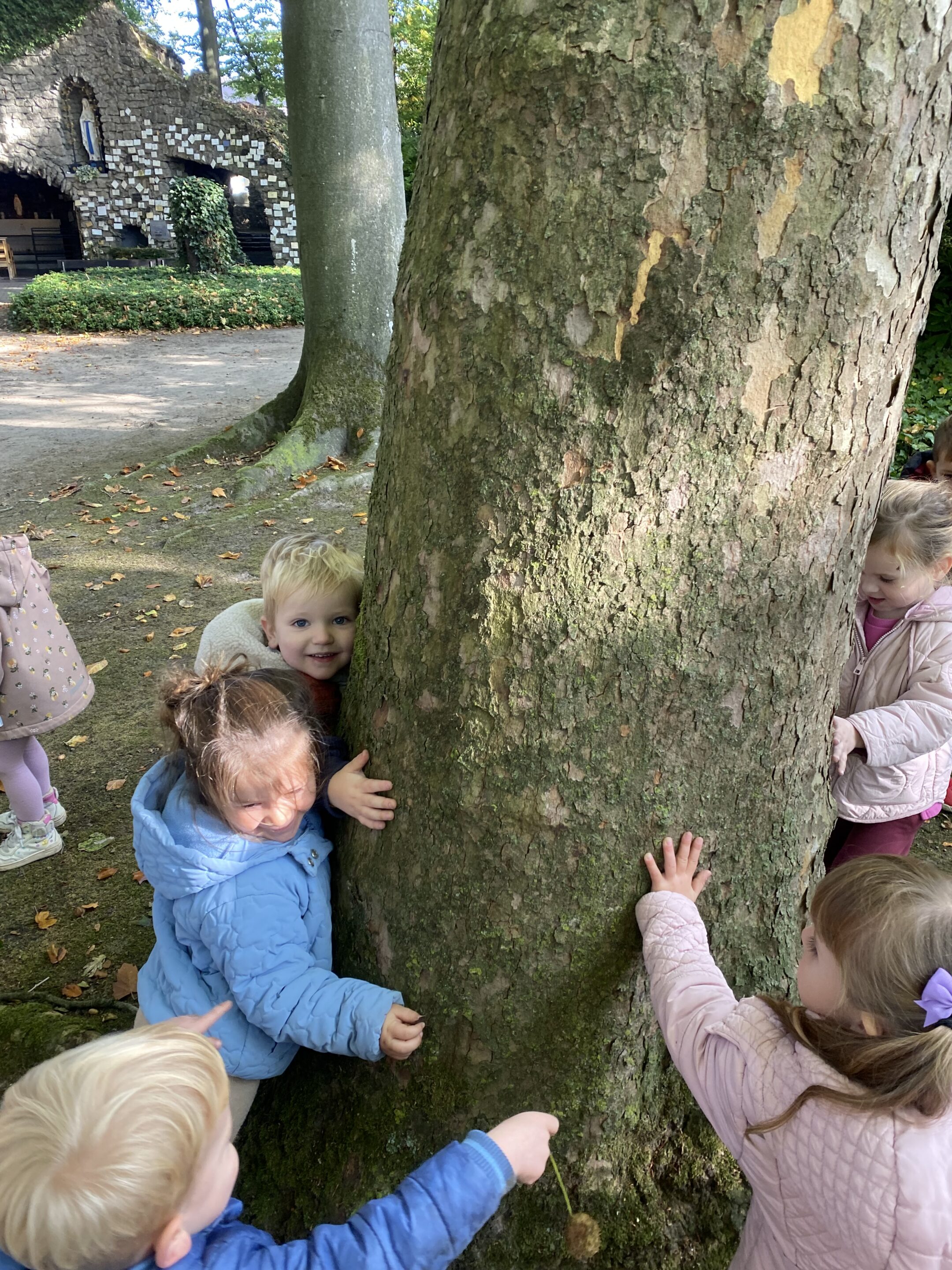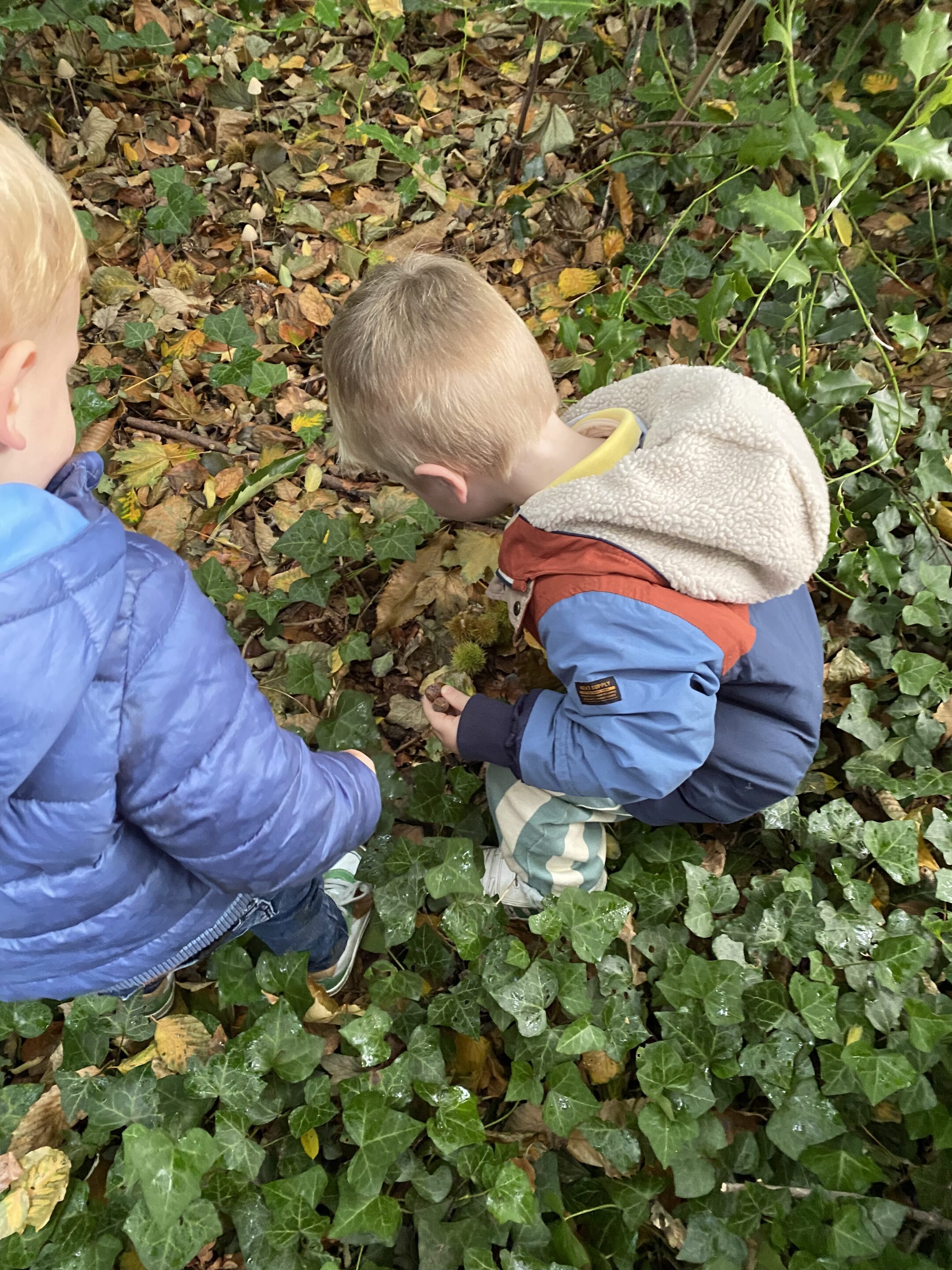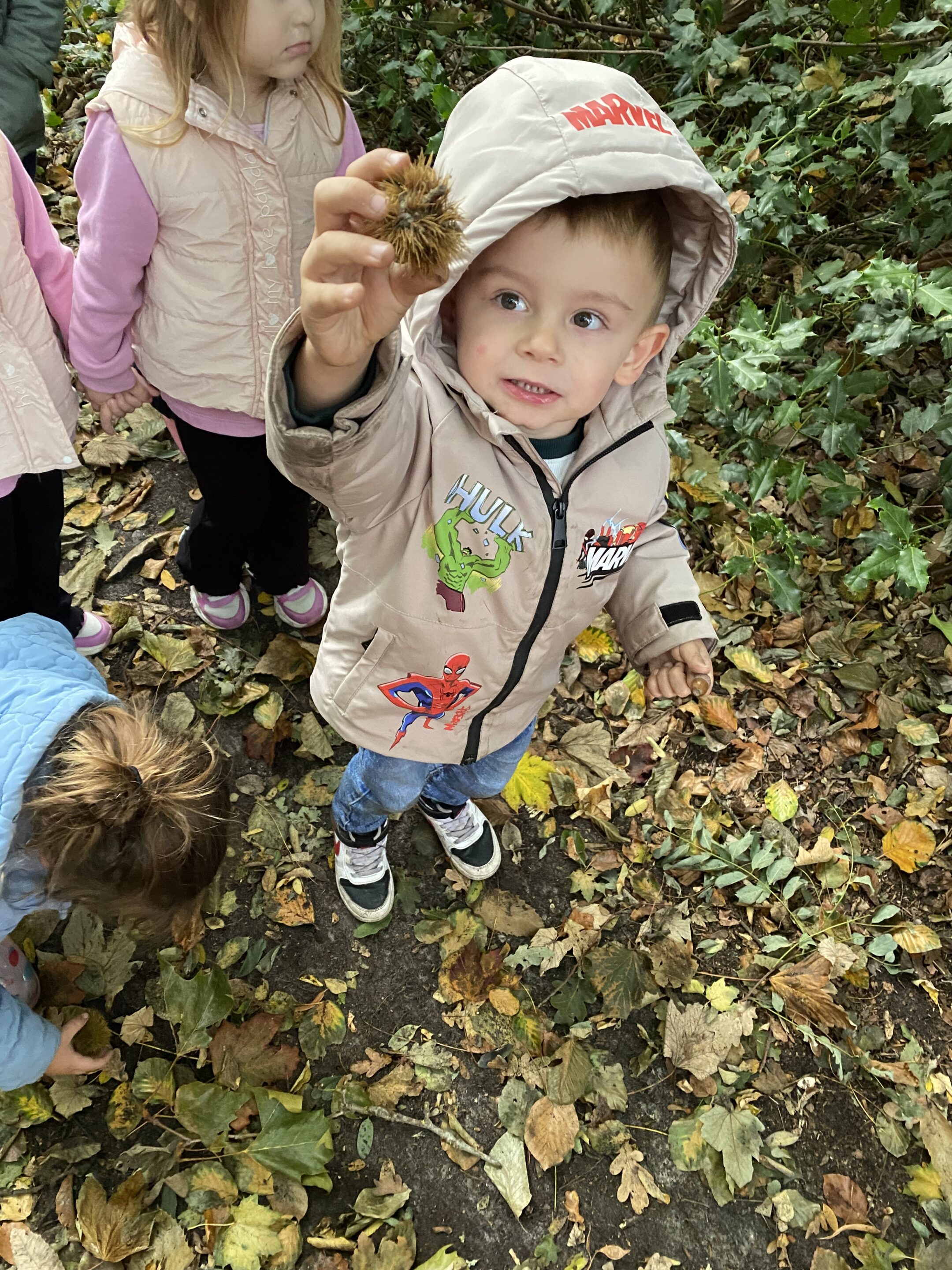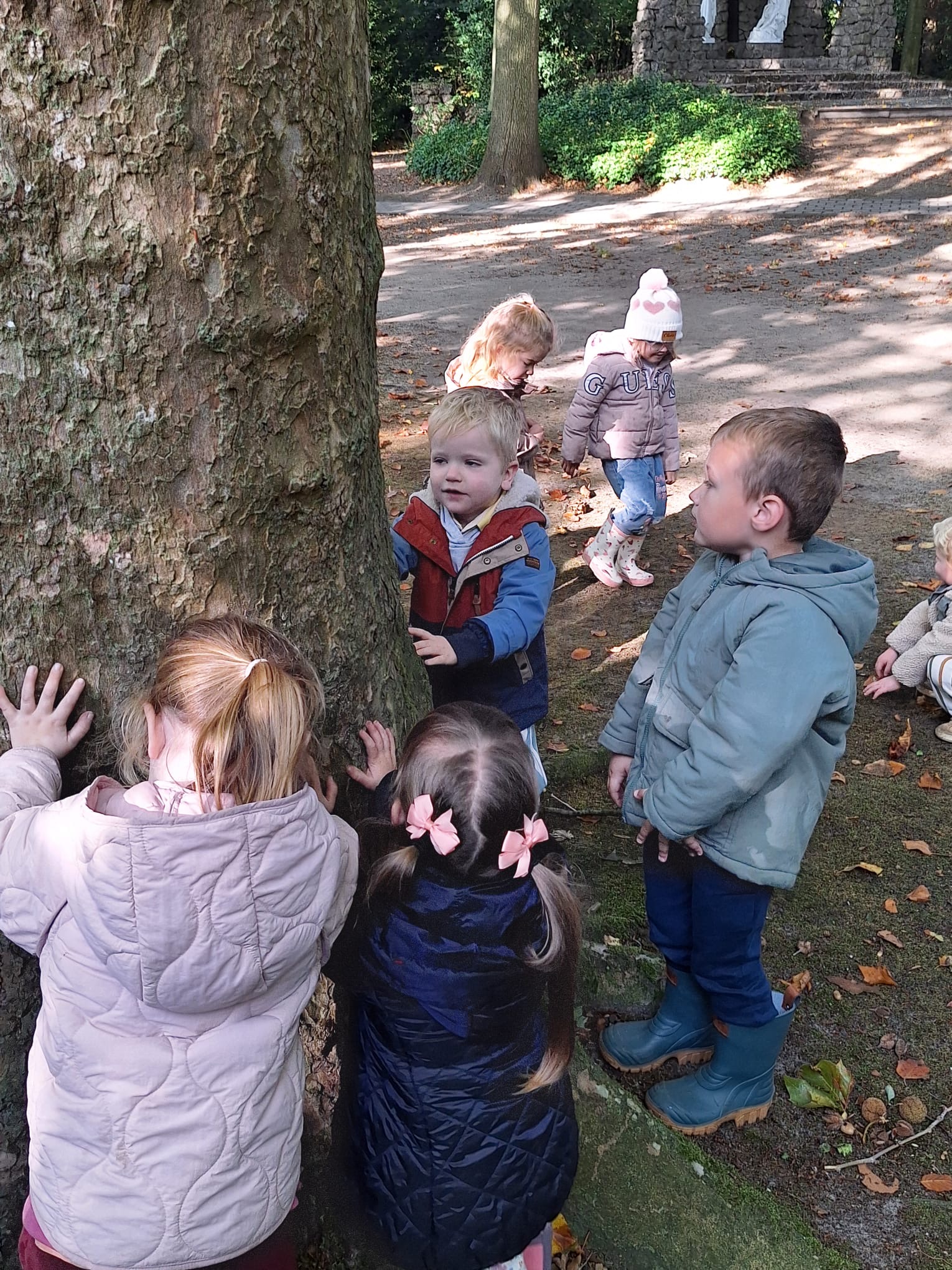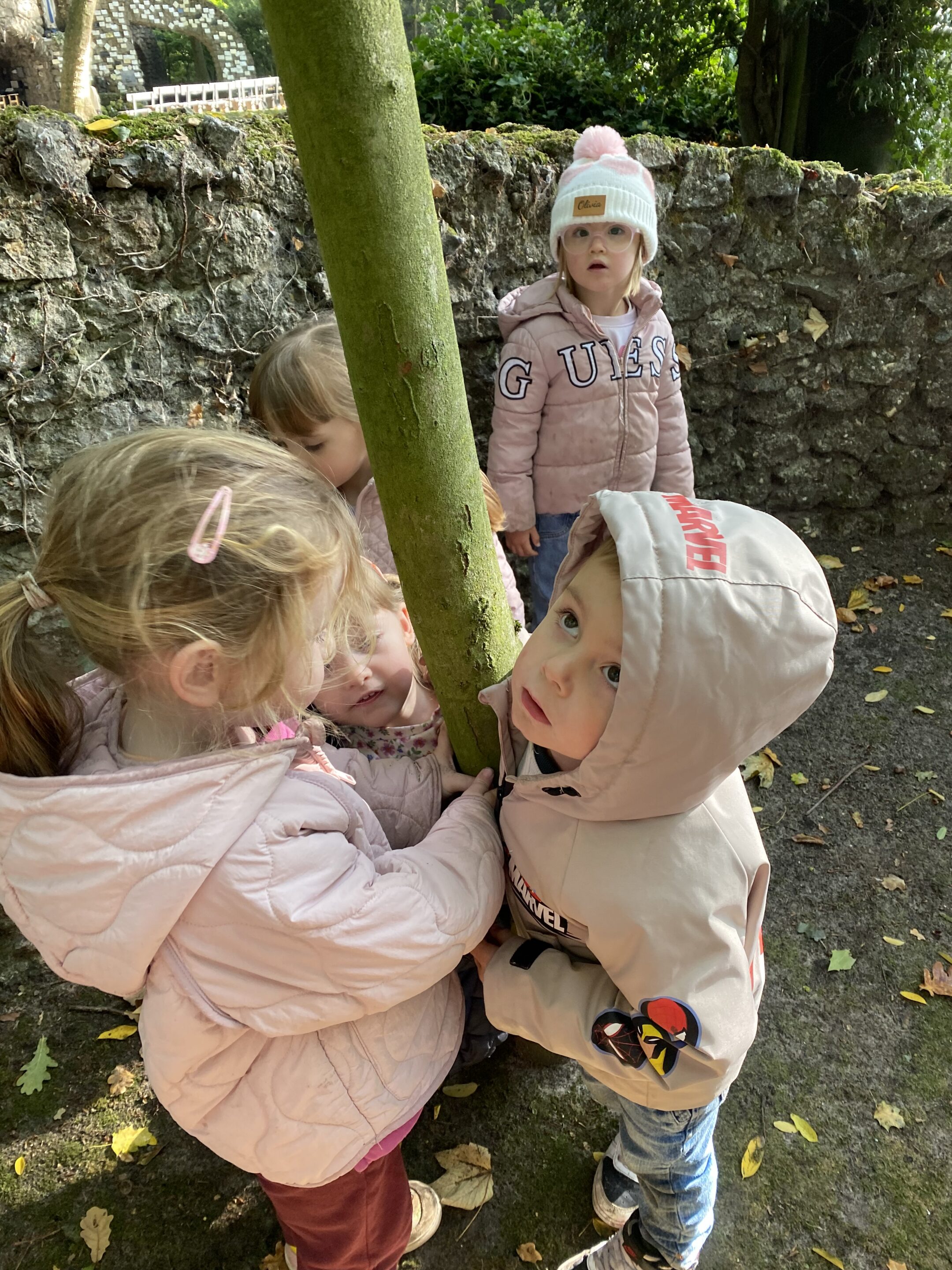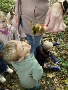 Op donderdagvoormiddag gingen we als start van ons thema: ‘herfstschatten in het bos’ op pad voor een boswandeling. We verzamelden heel wat herfstvruchten zoals kastanjes, eikels, bolsters, beukennapjes, … We sprongen in de blaadjes en gooiden ze in de lucht. We knuffelden de bomen en vergeleken de stammen met elkaar. Wat een mooie voormiddag!