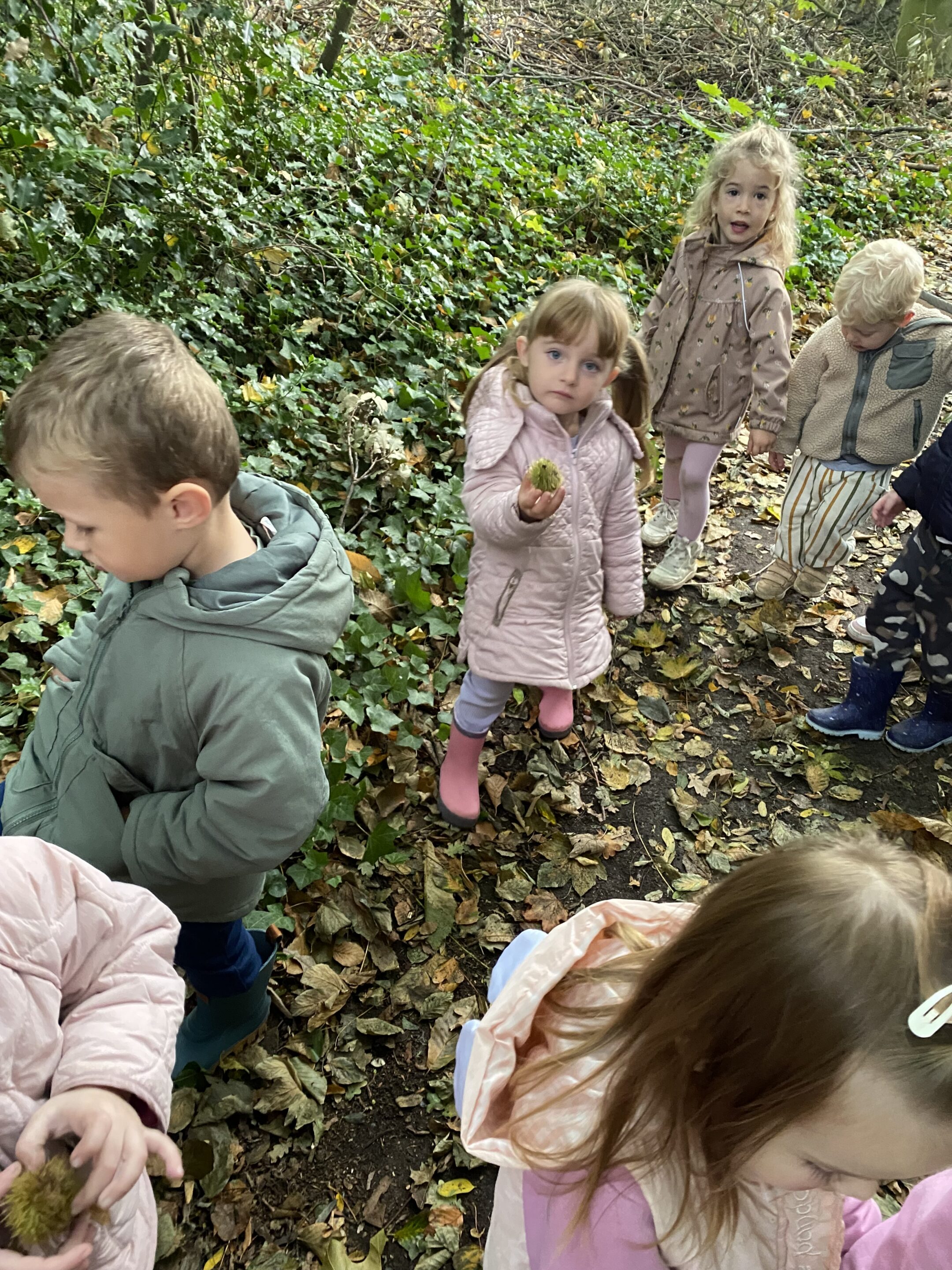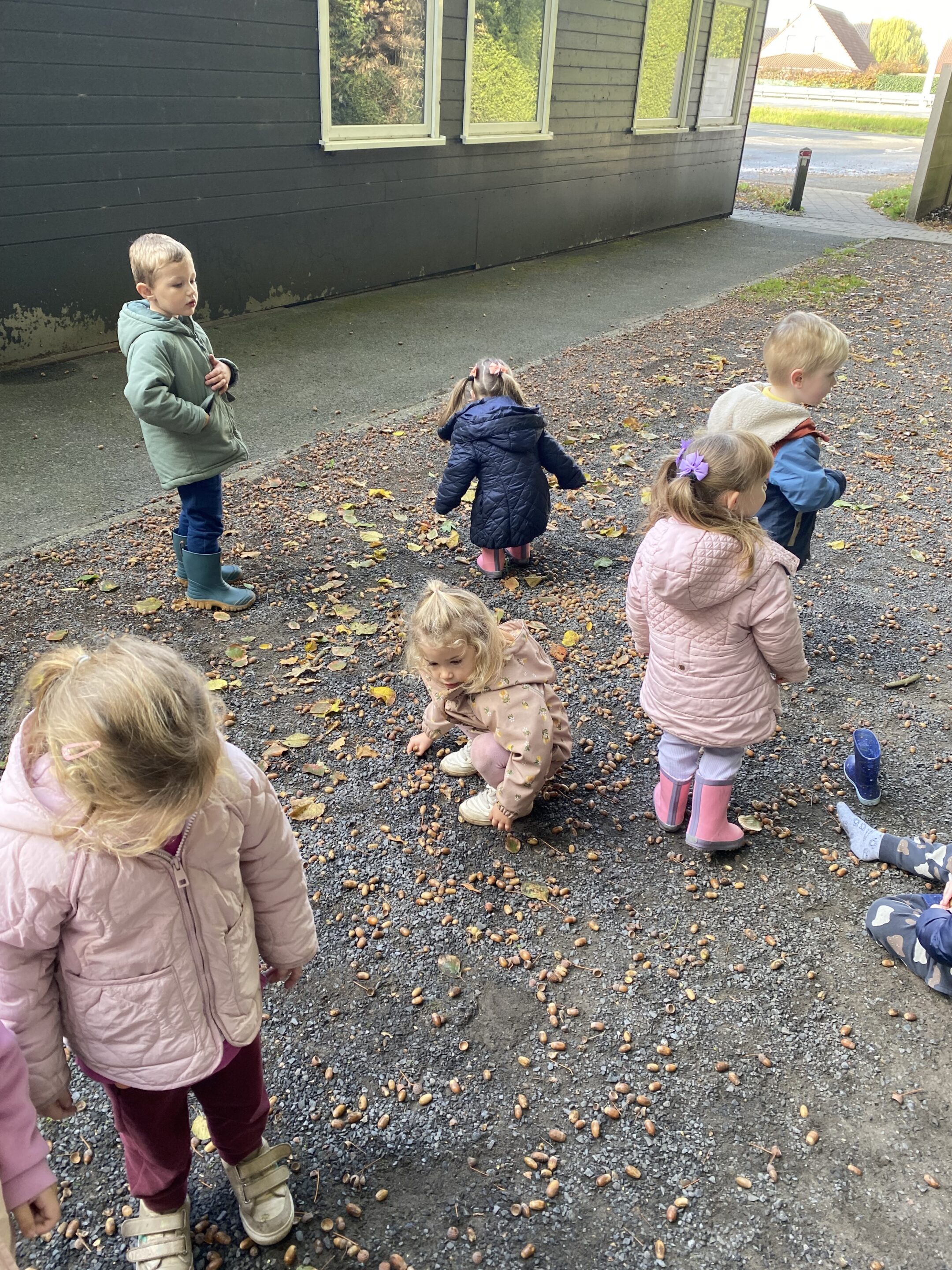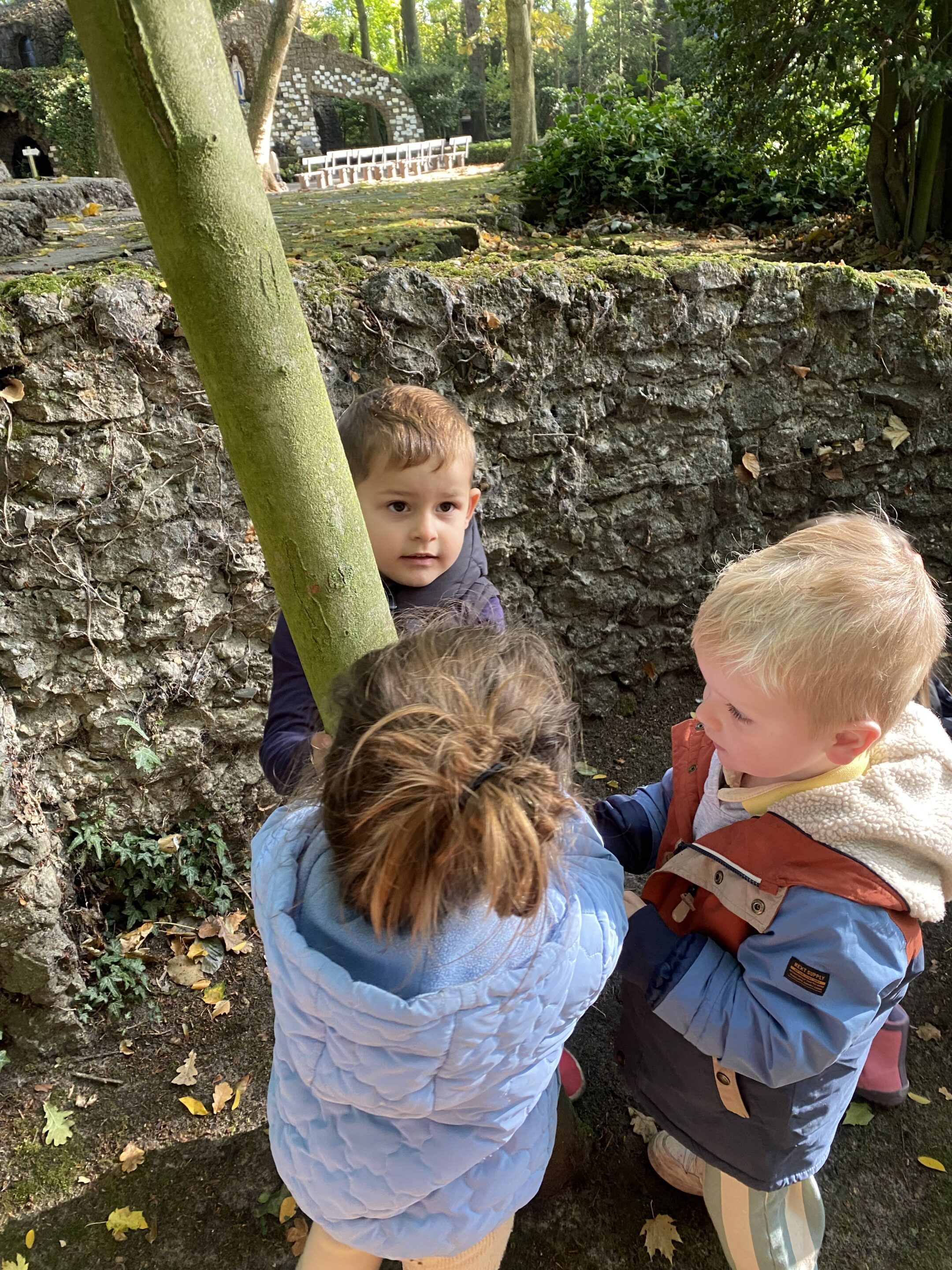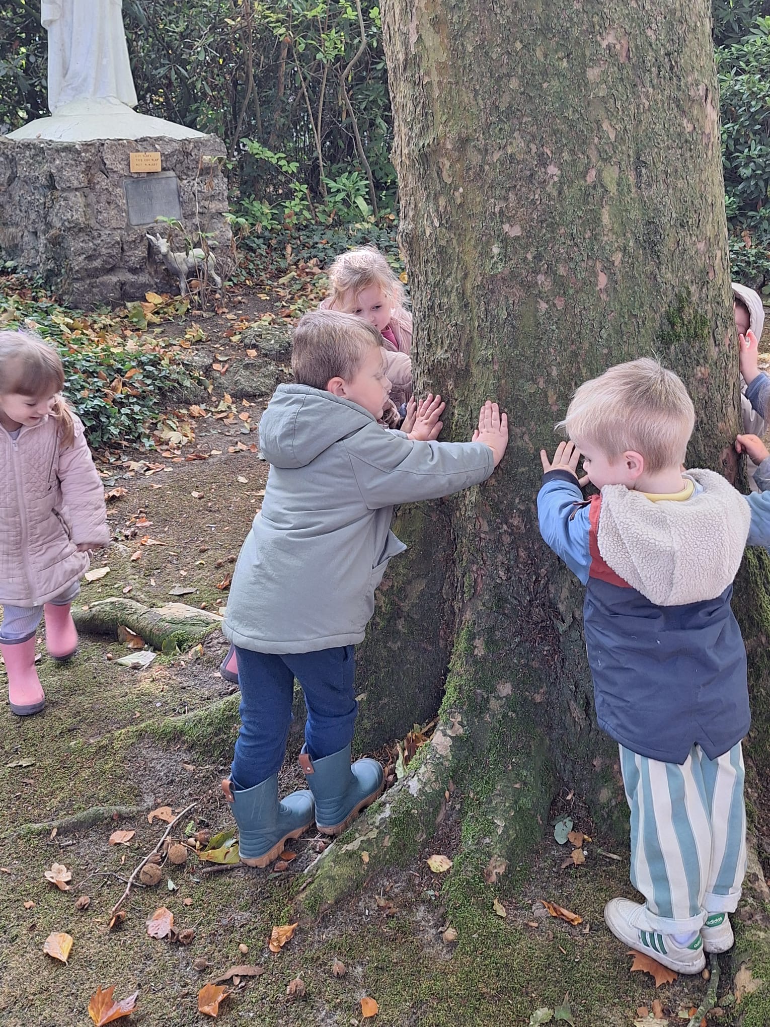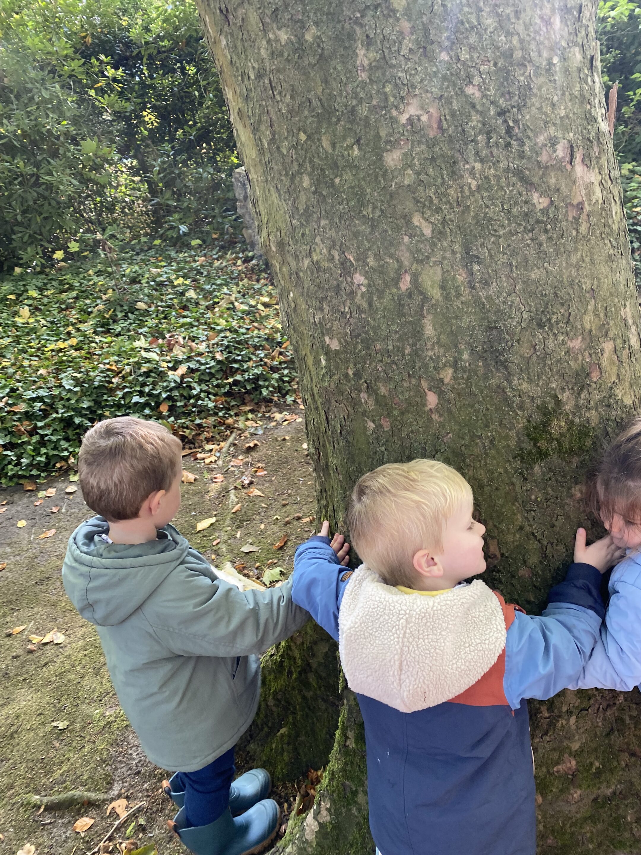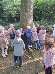 Op donderdagvoormiddag gingen we als start van ons thema: ‘herfstschatten in het bos’ op pad voor een boswandeling. We verzamelden heel wat herfstvruchten zoals kastanjes, eikels, bolsters, beukennapjes, … We sprongen in de blaadjes en gooiden ze in de lucht. We knuffelden de bomen en vergeleken de stammen met elkaar. Wat een mooie voormiddag!