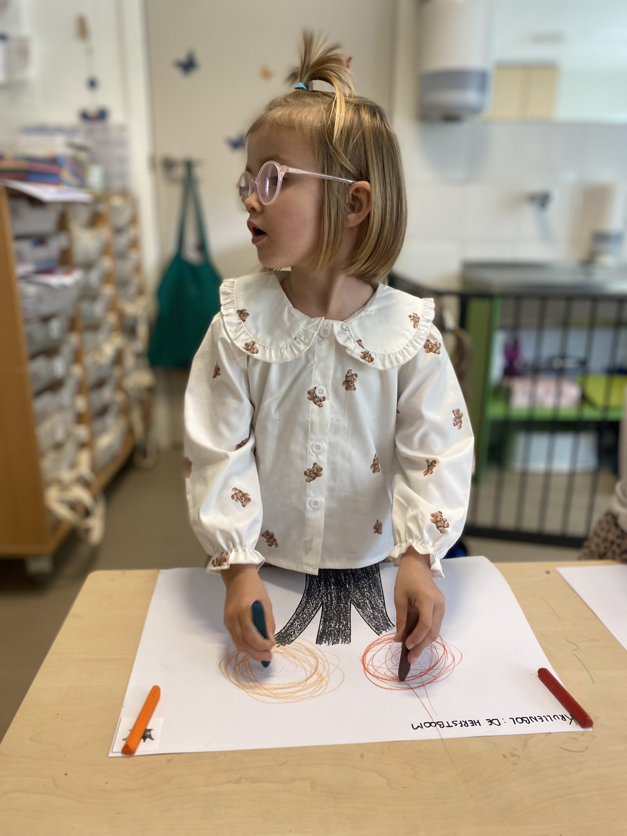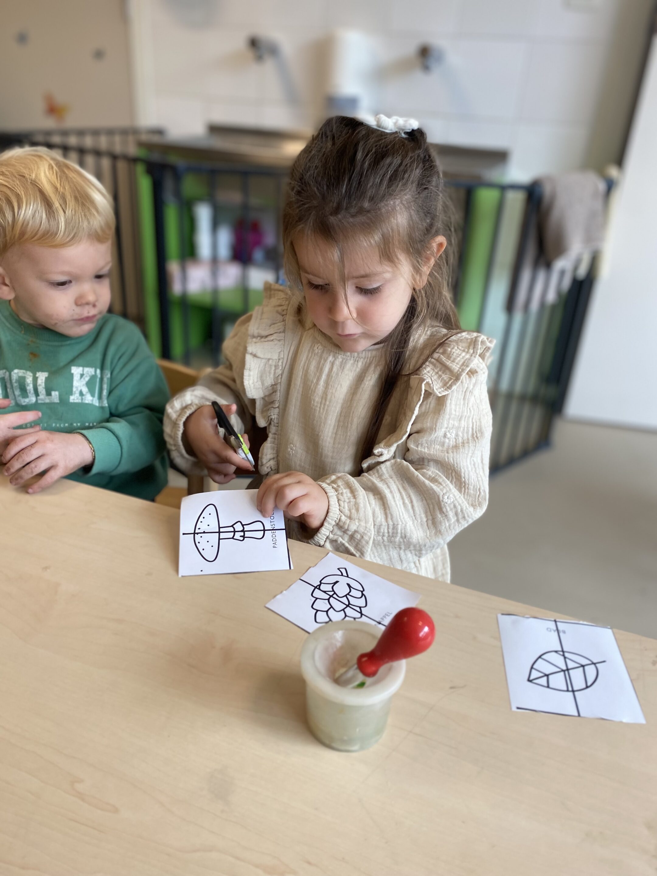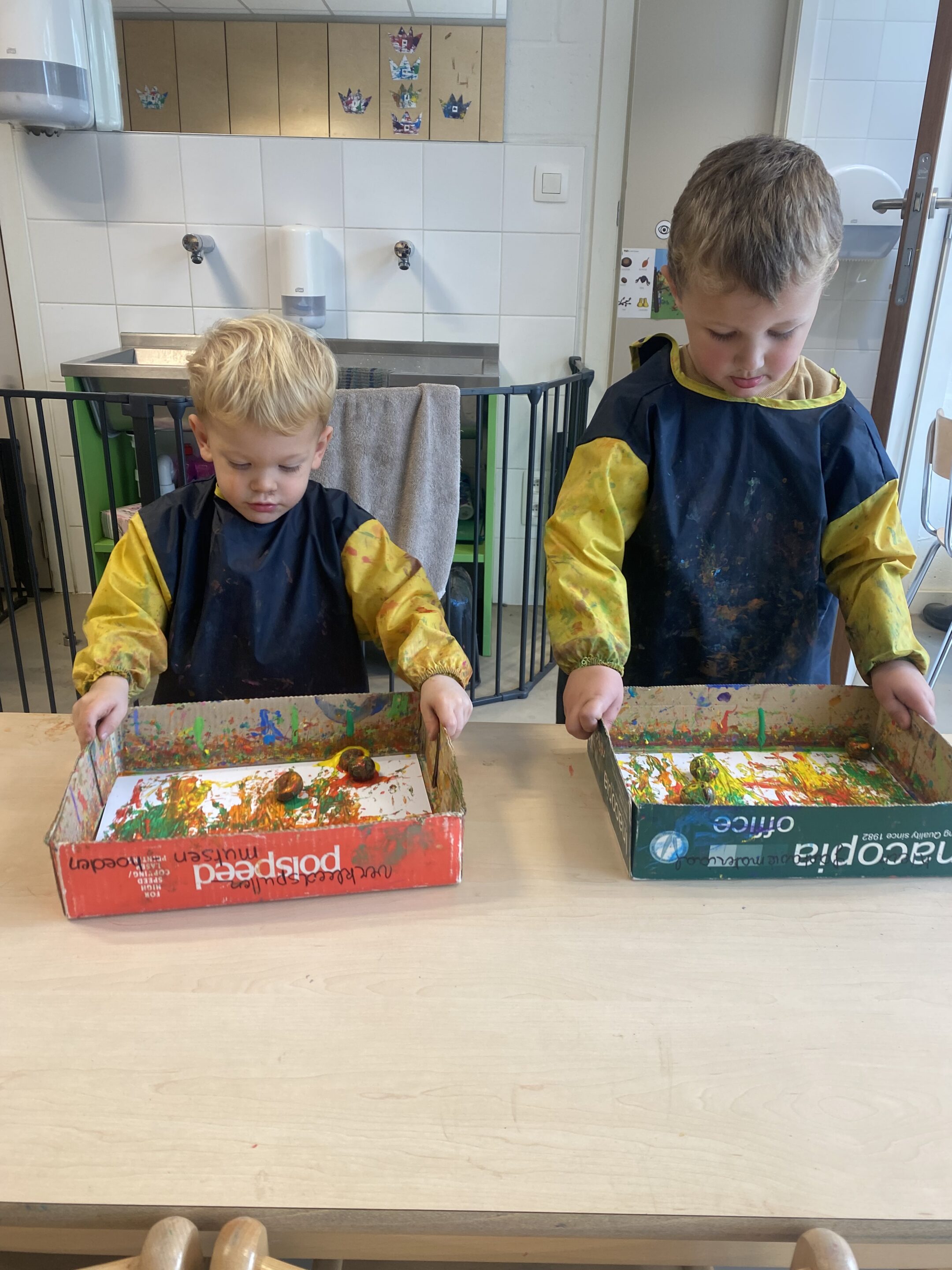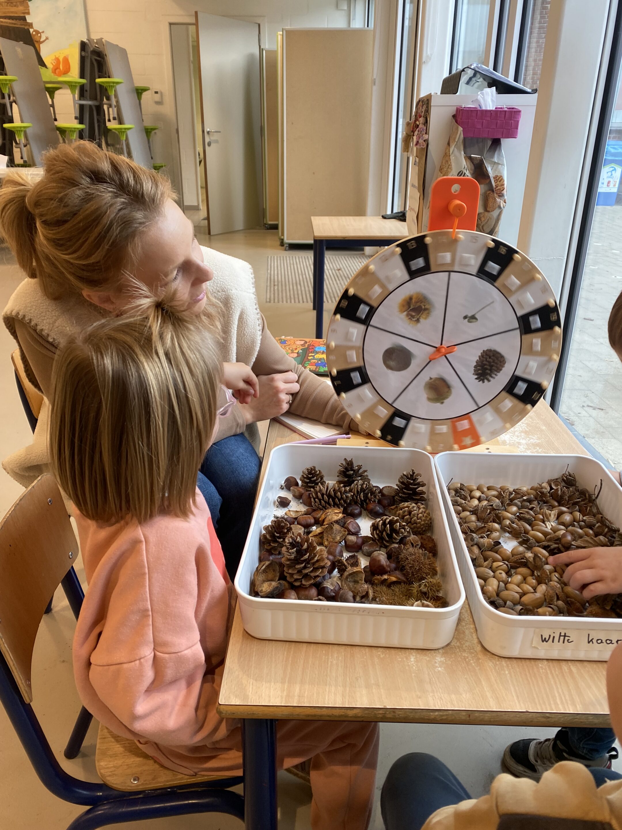 Donderdag gingen we van start met ons nieuwe thema: Herfstschatten in het bos. We begonnen met een boswandeling, waarbij we samen op zoek gingen naar herfstvruchten en genoten van de prachtige herfstkleuren. Terug in de klas gingen we creatief aan de slag: we onderzochten, sorteerden en benoemden de gevonden herfstvruchten zoals eikels, kastanjes en bolsters. Ook werkten we rond de kleuren van de herfst: rood, oranje, geel en bruin. We kleurden, knutselden en ontdekten zo al spelend al het mooie van de herfst.