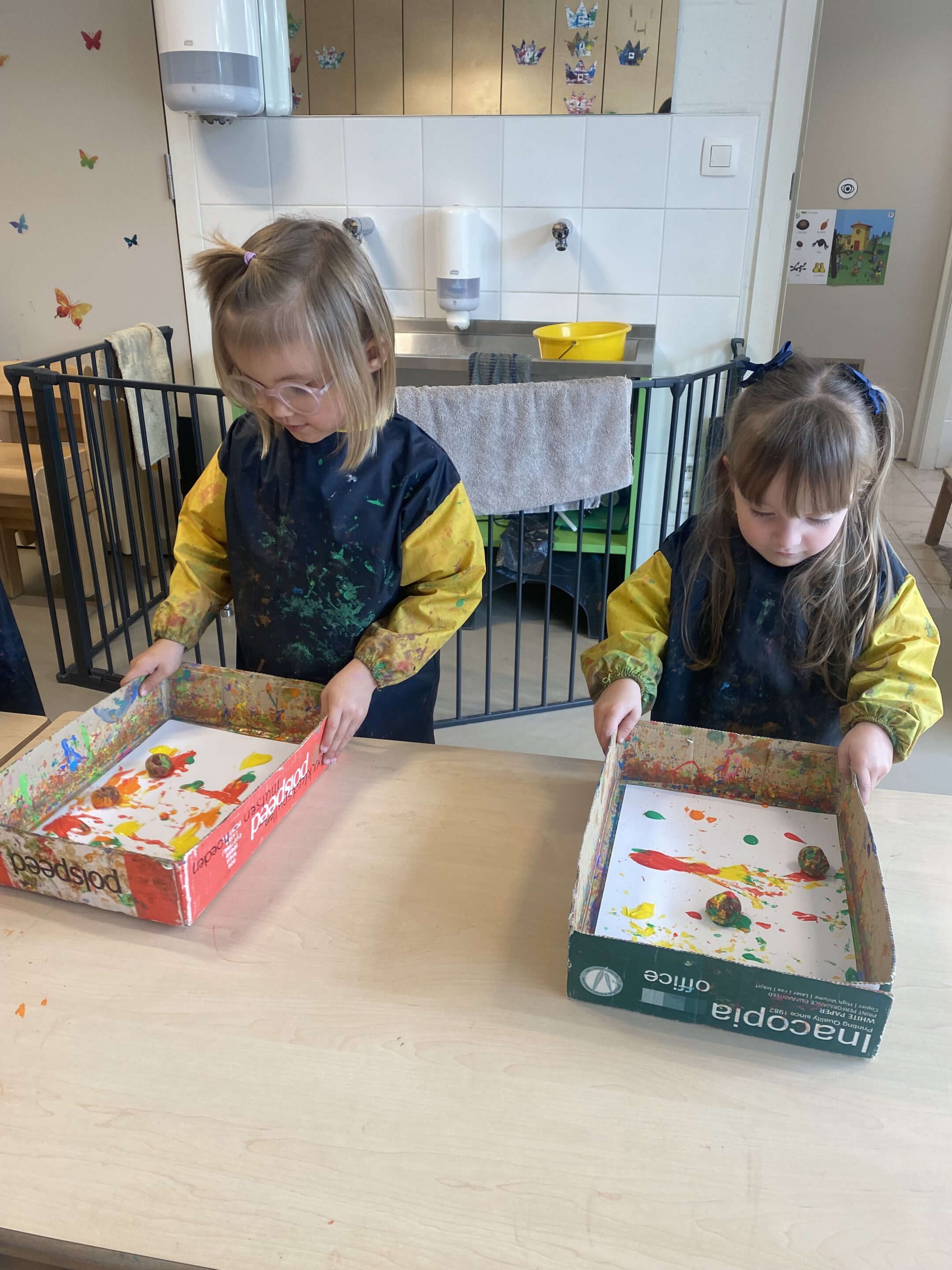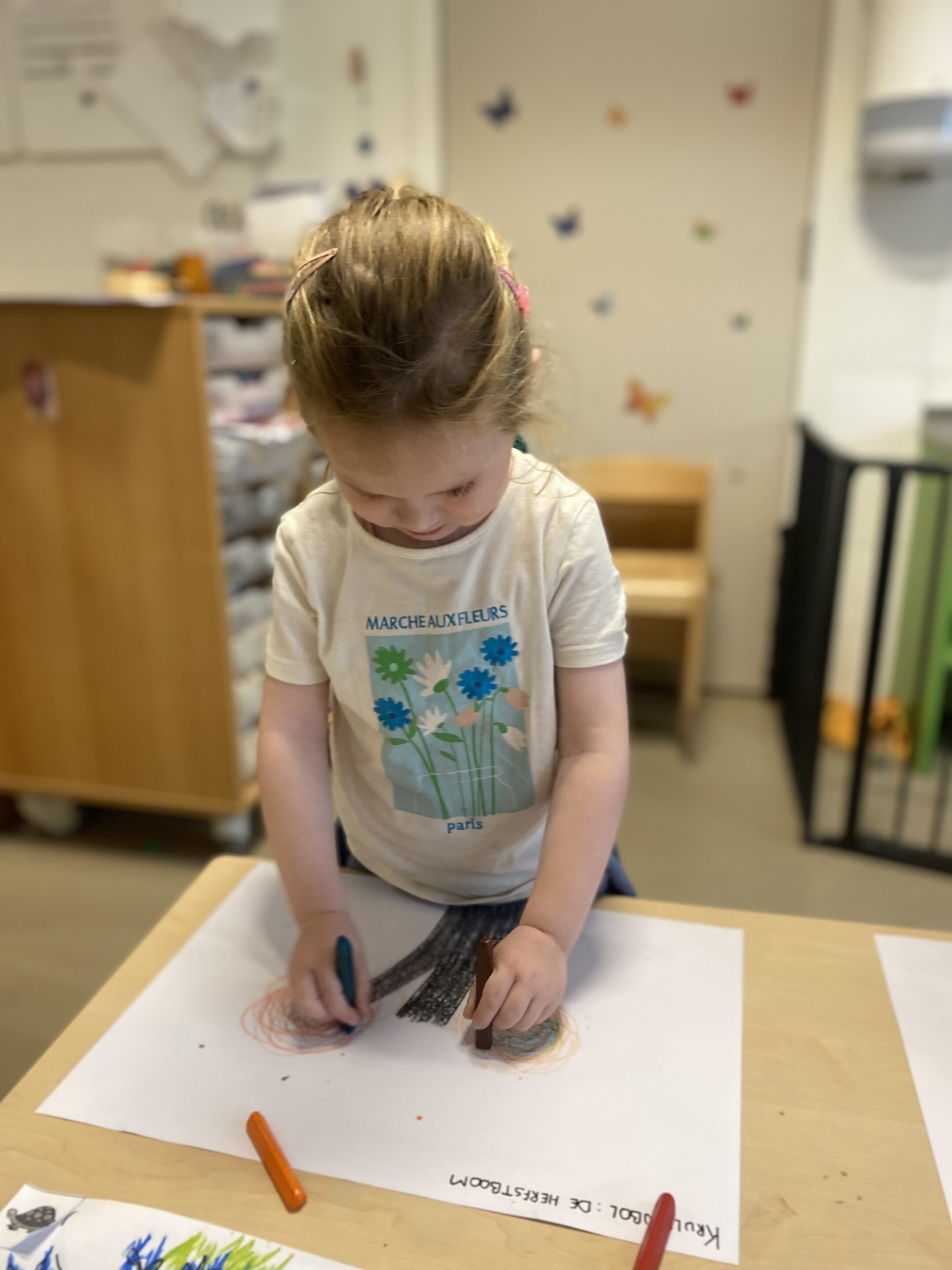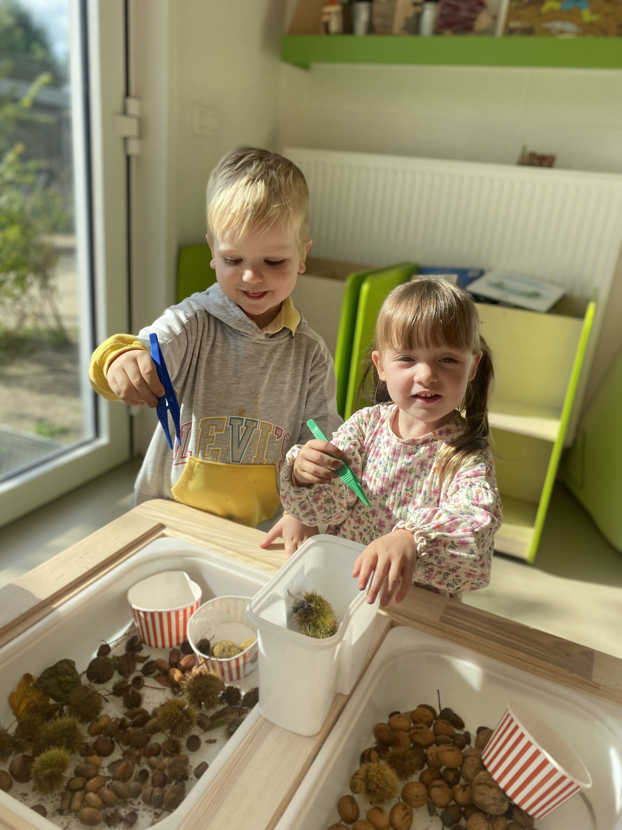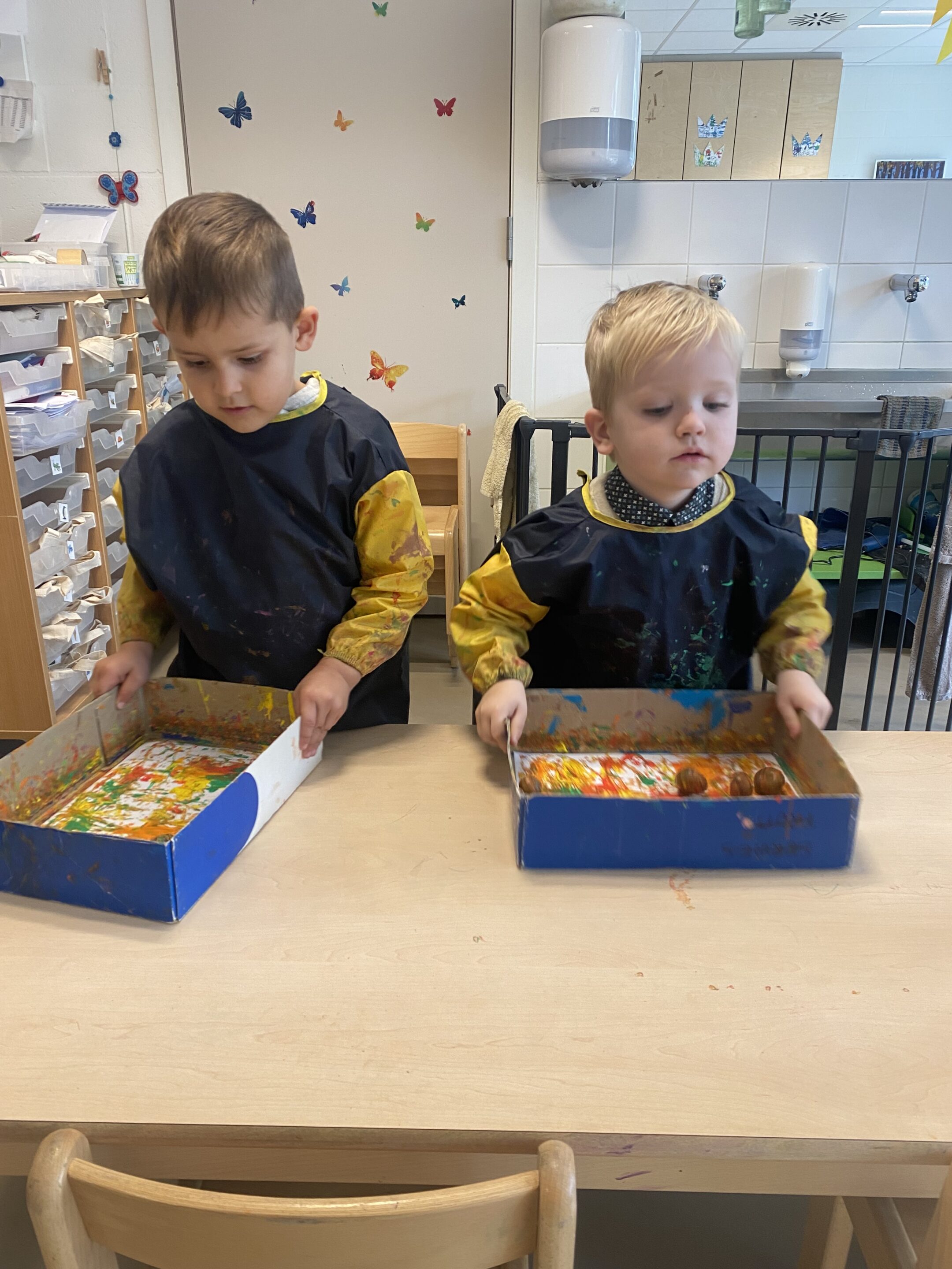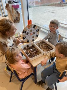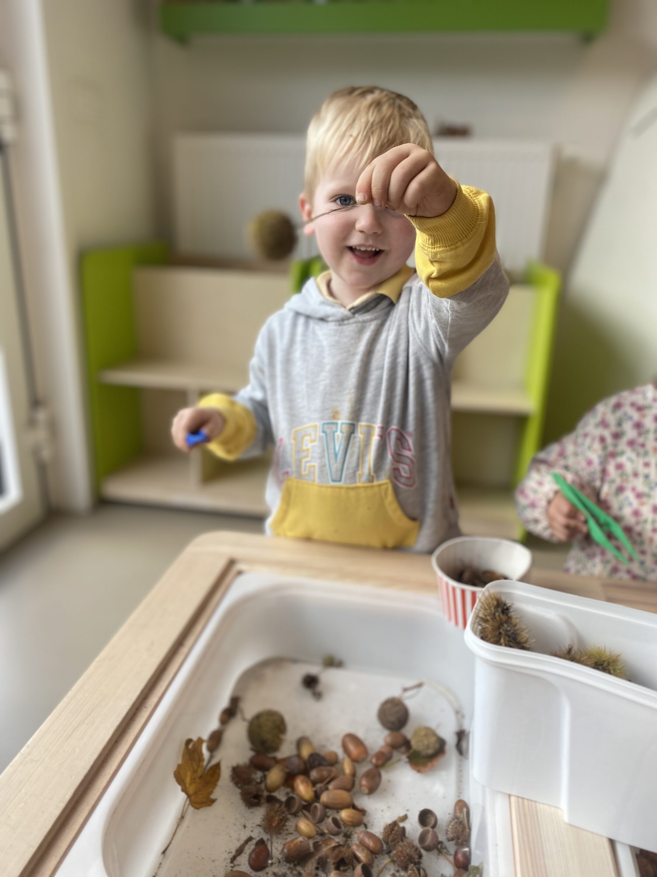 Donderdag gingen we van start met ons nieuwe thema: Herfstschatten in het bos. We begonnen met een boswandeling, waarbij we samen op zoek gingen naar herfstvruchten en genoten van de prachtige herfstkleuren. Terug in de klas gingen we creatief aan de slag: we onderzochten, sorteerden en benoemden de gevonden herfstvruchten zoals eikels, kastanjes en bolsters. Ook werkten we rond de kleuren van de herfst: rood, oranje, geel en bruin. We kleurden, knutselden en ontdekten zo al spelend al het mooie van de herfst.