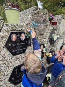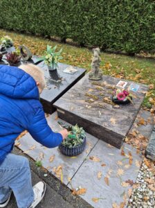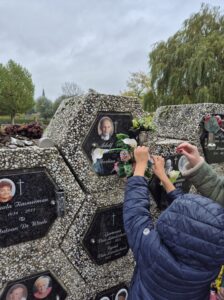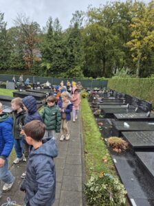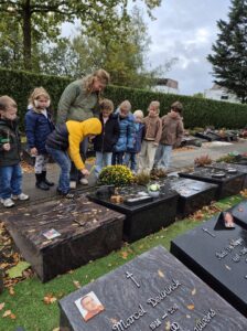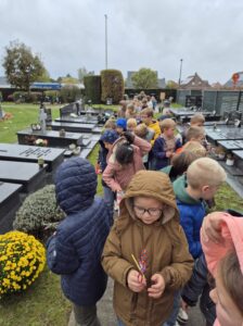 We spraken ook over Allerheiligen en Allerzielen. Samen gingen we op bezoek naar het kerkhof om stil te staan bij de mensen die we missen. We maakten een bloemetje met een patroon om op het kerkhof te leggen. ๐ผ