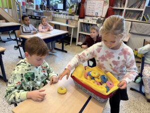In een meetcircuit gingen we aan het werk met de natuurlijke maateenheden: 1 liter, 1 meter, 1 kilogram. We moesten heel goed samenwerken om de opdracht juist uit te voeren. Ook leerden we heel goed schatten en op voorhand nadenken over ons resultaat.