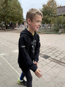 Ondertussen kunnen wij al vier hoofdletters schrijven: N, M, U en IJ. We oefenen telkens grootmotorisch alvorens we onze beste schrijfkunsten in ons schriftboekje laten zien.